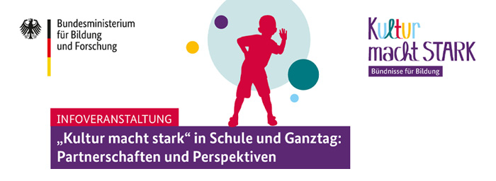 hiermit laden wir Sie zur digitalen Infoveranstaltung „Kultur macht stark in Schule und Ganztag: Partnerschaften und Perspektiven“ am 26. September 2024 ein. Von 14 bis 16 Uhr informiert das Bundesministerium für Bildung und Forschung über die Möglichkeiten, die sich Schulen und Ganztagsträgern im Programm „Kultur macht stark. Bündnisse für Bildung“ bieten.